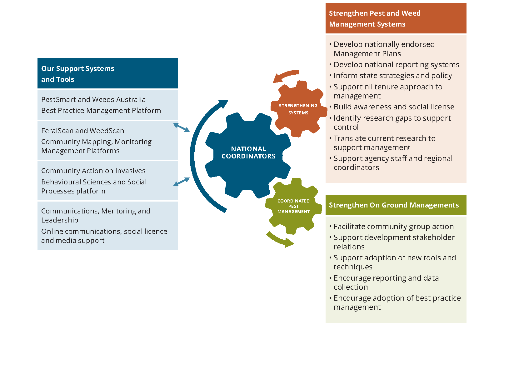 The model increases community awareness of invasive species and their impacts. It facilitates and strengthens on-ground community efforts to support strong pest and weed management approaches at national, state and local levels while fostering the adoption of support systems and tools like PestSmart and FeralScan.